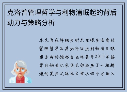 本文旨在详细分析尤尔根·克洛普的管理哲学及其如何促成利物浦足球俱乐部的崛起。自克洛普于2015年接掌利物浦以来,俱乐部经历了一段辉煌的复兴之路。本文章从四个方面入手,探讨克洛普管理哲学的核心要素,并结合利物浦崛起的背后动力与策略进行分析。这四个方面包括:克洛普的战术理念、球队文化的塑造、球员管理与团队建设、以及俱乐部运营与战略发展。通过这四个方面的深入探讨,本文希望为读者提供一个全方位理解克洛普及其影响力的视角。 尤尔根·克洛普的战术理念是利物浦崛起的基石之一。他的“重金属足球”(gegenpressing)成为了球队风格的象征。这种战术要求球员在失去控球后迅速进行高压反抢,以最大限度地限制对方的传球空间,迫使对方犯错。这种快速的进攻反应和密集的防守压迫让利物浦在对阵任何对手时都充满了威胁。 克洛普非常注重高强度的团队合作与集体行动。他的战术并不仅仅依靠个人的技巧,而是强调全队的紧密配合和快速转换。从前场的“对抗式”压迫到后场的精确传递,每一个细节都被精心设计,以确保整体运作的高效性。 更重要的是,克洛普的战术哲学不仅仅是防守反击或是对抗性压迫,更是一个有机的整体进攻体系。通过高位压迫,球队能够迅速夺回控球并发动快速反击,利用边路突破和中路的快速传导创造进攻机会。这种战术的成功不仅体现在成绩上,也改变了足球比赛中的战略格局。 克洛普在利物浦的成功不仅仅依赖于战术层面的执行,更在于他如何塑造了一种强大的球队文化。克洛普非常注重球员心理的建设,他强调“家族精神”,并将其融入到球队的日常管理中。每一位球员都被视为重要的团队成员,克洛普在管理中倡导团结、互信与共同目标的理念。 这种文化的塑造不仅仅体现在球场上的默契配合,还体现在球队成员之间的关系和外部沟通中。克洛普推崇一种以球员为核心的文化,每一位球员都能感受到自己对球队的贡献和价值。这种尊重与信任的氛围促使球员在比赛中全力以赴,付出更多的努力。 此外,克洛普的文化塑造还体现在他如何处理球队的挫折与压力。无论是英超联赛的竞争压力,还是欧洲赛场的激烈对抗,克洛普总能带领球队以积极的心态去面对挑战。他通过正面的心态和坚定的信念,帮助球员在高压环境下保持冷静,并激发出潜力。这种文化的核心价值观已经深深植根于每一个利物浦球员的心中。 克洛普的球员管理策略在利物浦的崛起过程中扮演了至关重要的角色。他深知,只有通过建立一个团结一致的团队,才能够在高强度的竞争中脱颖而出。在球员的选择与培养上,克洛普展现了极高的智慧。他非常注重球员的心理素质和团队意识,而不仅仅看重他们的技术能力。 克洛普非常擅长挖掘和提升球员的潜力。例如,他将萨迪奥·马内、穆罕默德·萨拉赫和罗伯托·菲尔米诺等球员从相对不为人知的身份推向了世界级的水平。在他的指导下,这些球员不仅提升了个人能力,更成为了利物浦战术体系中的关键人物。 此外,克洛普非常注重团队氛围的建设。他知道,要想在竞争激烈的赛季中保持持续的高水平表现,球队成员之间的良好关系是至关重要的。因此,他倡导一种开放、包容的沟通环境,鼓励球员们相互支持和互相激励。这种团队精神无疑是利物浦成功的催化剂。 利物浦的崛起不仅仅是在球场上取得了成功,俱乐部的运营与战略发展同样是其复兴的重要推动力。克洛普加入利物浦后,俱乐部管理层与他形成了良好的合作关系,双方共同推动了球队的战略布局。克洛普不仅仅是战术大师,更是俱乐部长期发展战略的重要参与者。 首先,利物浦在转会市场上的精准投资是其崛起的关键之一。克洛普与体育总监迈克尔·爱德华兹密切合作,共同确定了球队的转会方向。在这些转会操作中,利物浦不仅注重年轻球员的引进,更注重球员与球队战术的契合度。例如,球队引入了维吉尔·范迪克和阿利森等世界级球员,他们在球队防守端的提升直接带动了利物浦整体水平的提升。 此外,利物浦的球迷文化和全球品牌价值也得到了极大的提升。克洛普的成功让利物浦成为了全球球迷的焦点,俱乐部的商业价值得到了空前的增长。在这种良性循环下,利物浦得以在全球范围内吸引更多的投资,并且进一步提升了其在国际足坛的地位。 总结: 克洛普的管理哲学不仅仅是战术层面的创新,更在于他对球队文化、球员管理和俱乐部战略的深远影响。通过高强度的战术要求、强大的团队文化、精确的球员管理和合理的战略发展,克洛普带领利物浦走向了复兴并取得了辉煌的成就。 未来,克洛普的管理哲学不仅会继续塑造利物浦的成功,也将对全球足球管理产生深远的影响。其他俱乐部可以从利物浦的成功中汲取经验,尤其是在团队精神、战术执行和管理思维方面的借鉴。克洛普的成功证明了一个强大的管理哲学和清晰的发展方向对俱乐部的长期竞争力至关重要。1、克洛普的战术理念与执行